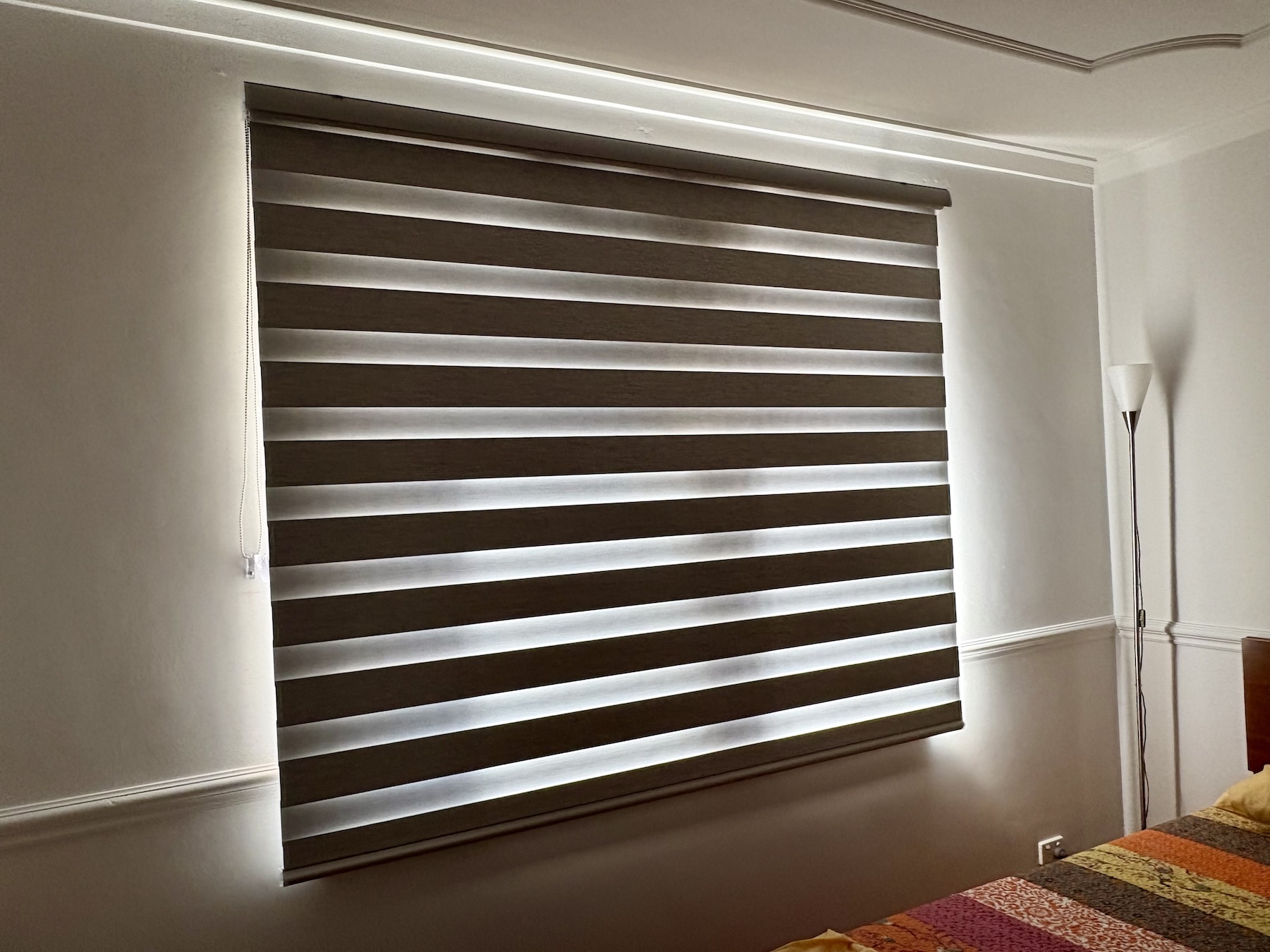 Zebra blinds (or vision/transition blinds) are modern window coverings with two layers of fabric featuring alternating sheer and opaque horizontal stripes.