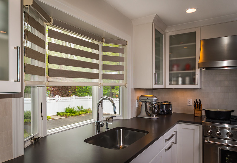 Zebra blinds (or vision/transition blinds) are modern window coverings with two layers of fabric featuring alternating sheer and opaque horizontal stripes.
